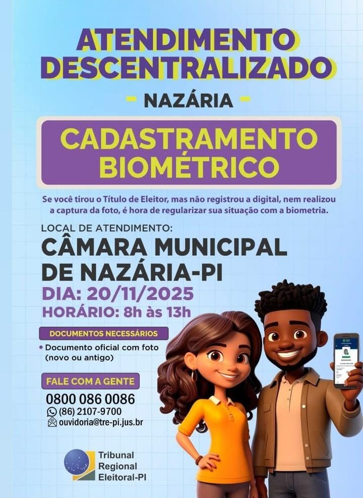 Atenção, eleitor(a) de Nazária! Nos dias 18 e 19 de setembro, um posto de atendimento do Tribunal Regional Eleitoral do Piauí (TRE-PI) estará funcionando na Câmara Municipal de Nazária, das 8h às 13h, para a realização do cadastramento biométrico.